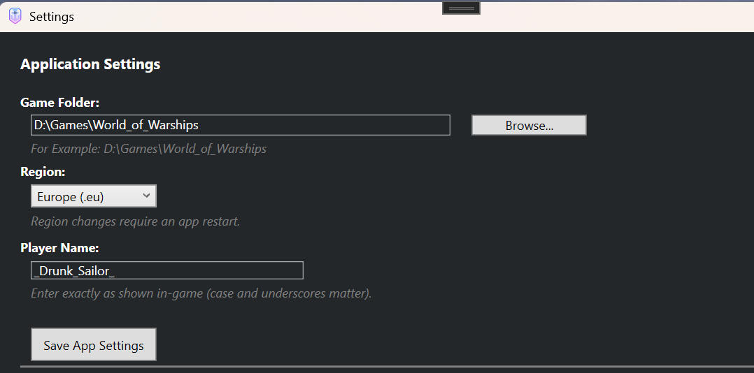 When the app is first launched, you will be shown the Settings window. The only required steps are to enter the path where the game is installed, choose your region, and click Save Settings.