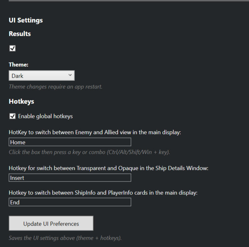 Here you can change the theme and the hotkeys for the Main UI (Match Monitor).