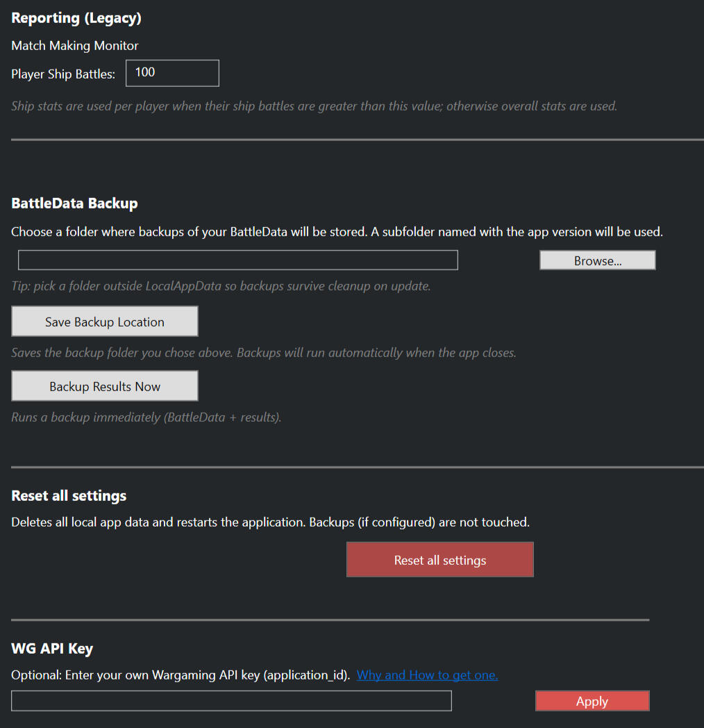 Reporting:When calculating the team strength, by defualt the Main UI and Match Making reports will use a players Ship WR if the player has over the number of battles stated in this field (by default 100).BattleData Backup:Here you can select where to backup your data.Reset all settings:Self explanatory.WG API KeyIf you would like to use your own key, please feel free to enter it here.