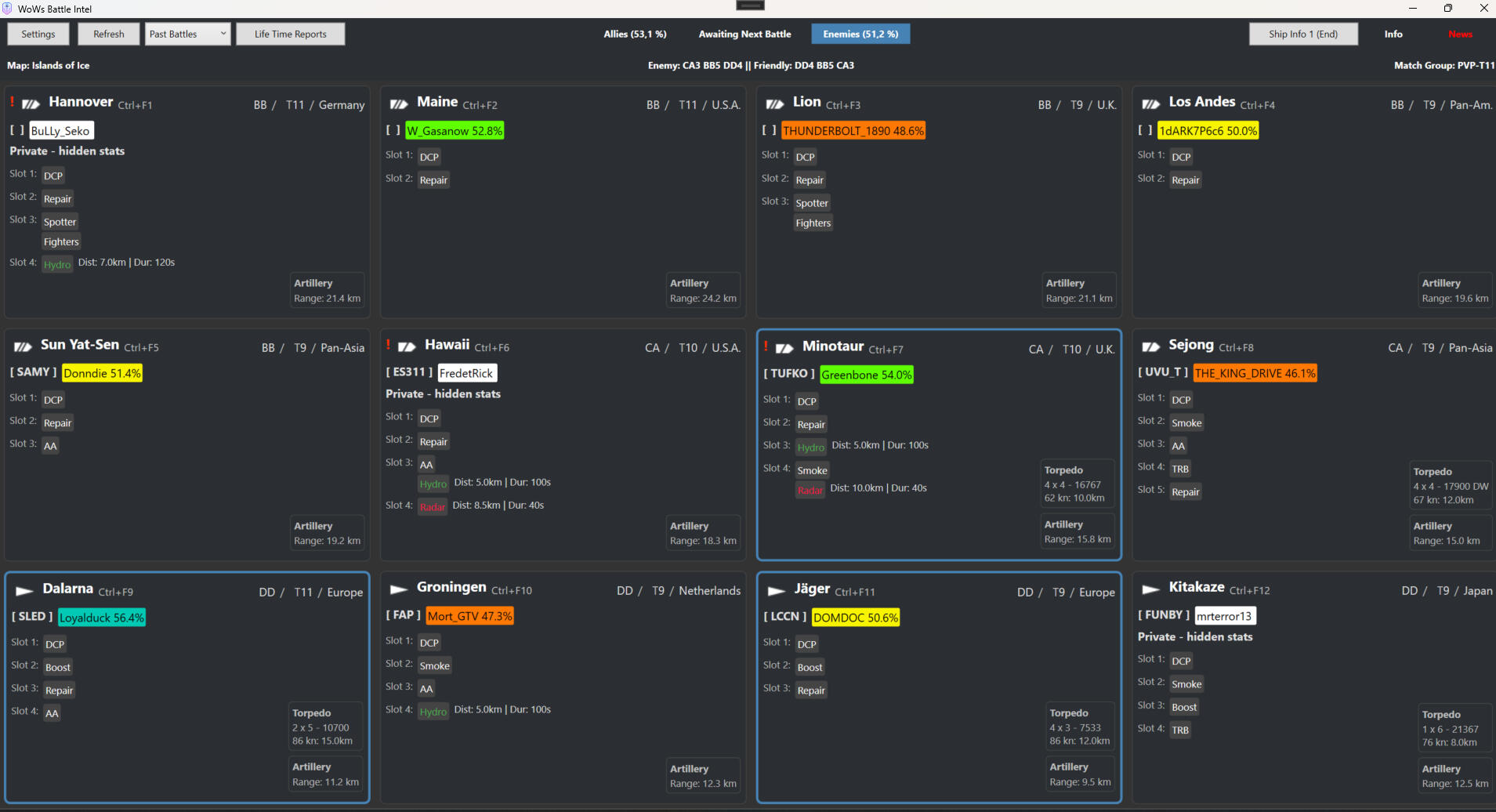 TextON the Main UI Screen, once a battle has started you will see at the top the non weighted win rates of each team. In the main body of the window you have 12 cards. One for each ship.
